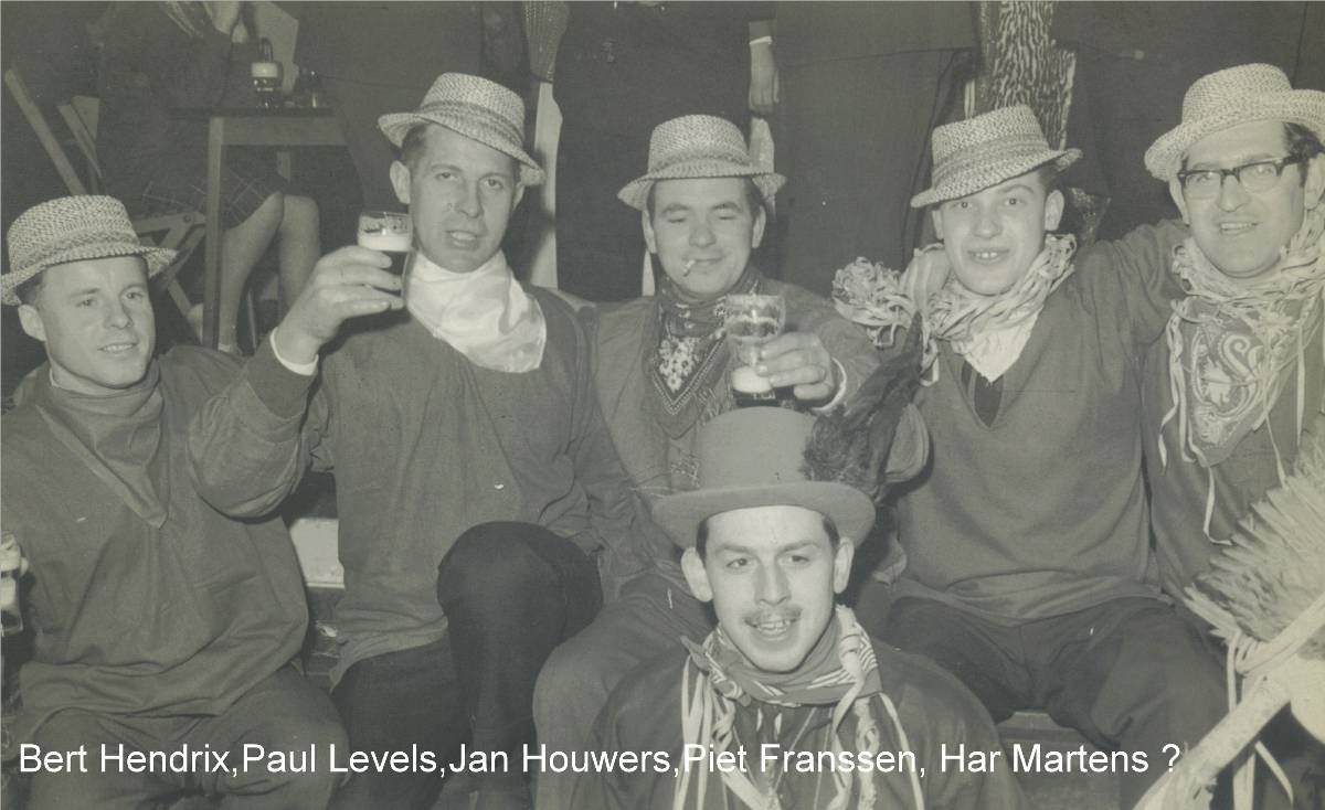 Carnaval 1954 Sjra Martens Carnaval Sjra Martens, Dre Janssen en Hugo Steeghs Carnaval zaal Paar Har Blomen, Anny Dagniaux en Hay Smeets Carnaval café de Sport Carnaval school Beesel Carnavals wagen Beesel 50-er jaren Carnaval Cafe's